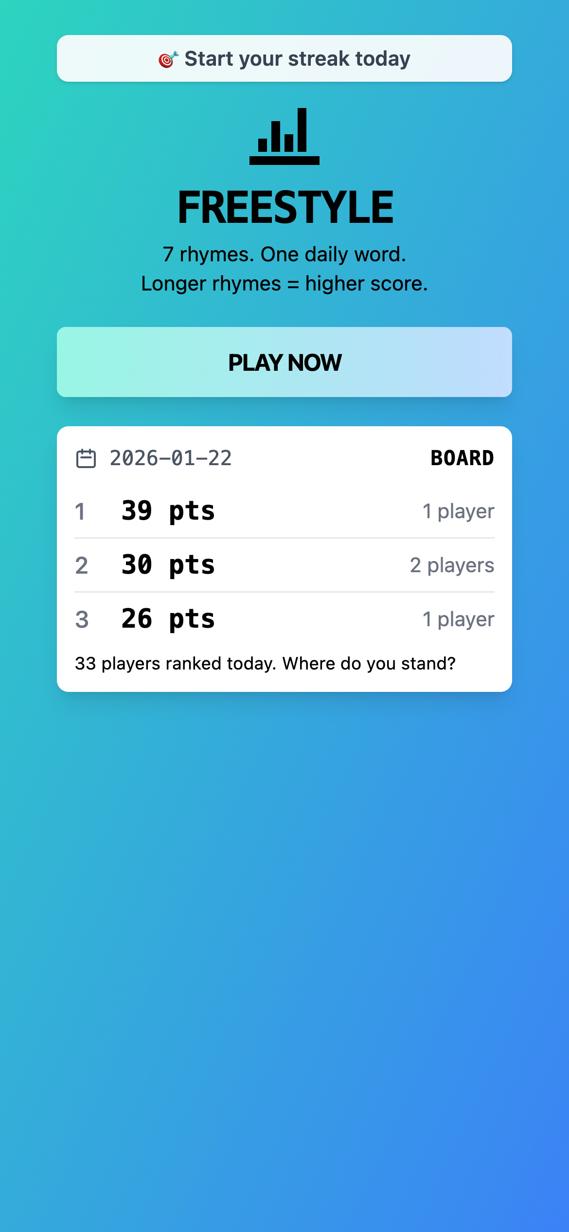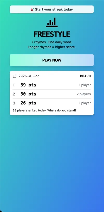 Freestyle is a browser-based word game that presents players with a new target word each day. The goal is to find 7 words that rhyme with it, using phonetic matching (based on sound, not spelling). Longer words and multi-syllable answers earn higher scores. The game includes daily leaderboards, streak tracking, and shareable results. Built in late 2023 by Taq Karim as a birthday gift for his wife—her idea, his code. Free to play, no account required, works on any device.